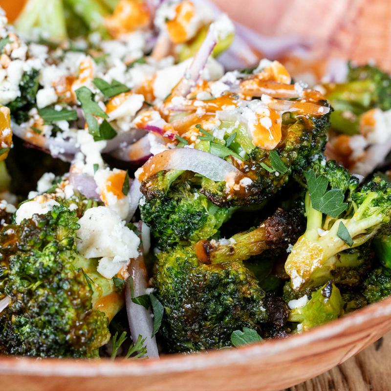 roasted broccoli, buffalo sauce, red onion, mixed herbs, bleu cheese
