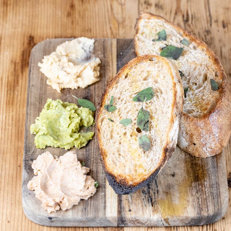 wood baked bread, maple cinnamon, roasted garlic, pistachio basil butters